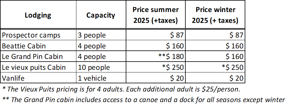 Two prospector camps are available for rental. They are both located approximately 100 meters from a parking lot. Access is on foot, or by snowshoes or cross-country skis. A sled or cart (depending on the season) is provided for transporting your personal belongings. The prospector camps are without electricity.