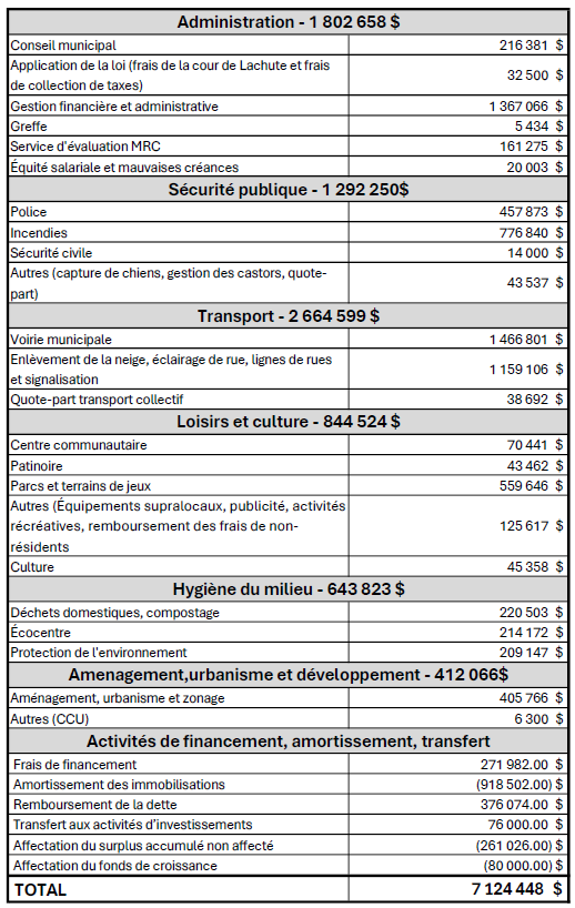 Le conseil autorise un budget de fonctionnement de 7 124 448 $ pour l’année à venir. Ce budget permettra de soutenir les services essentiels et les projets prioritaires de la municipalité.
