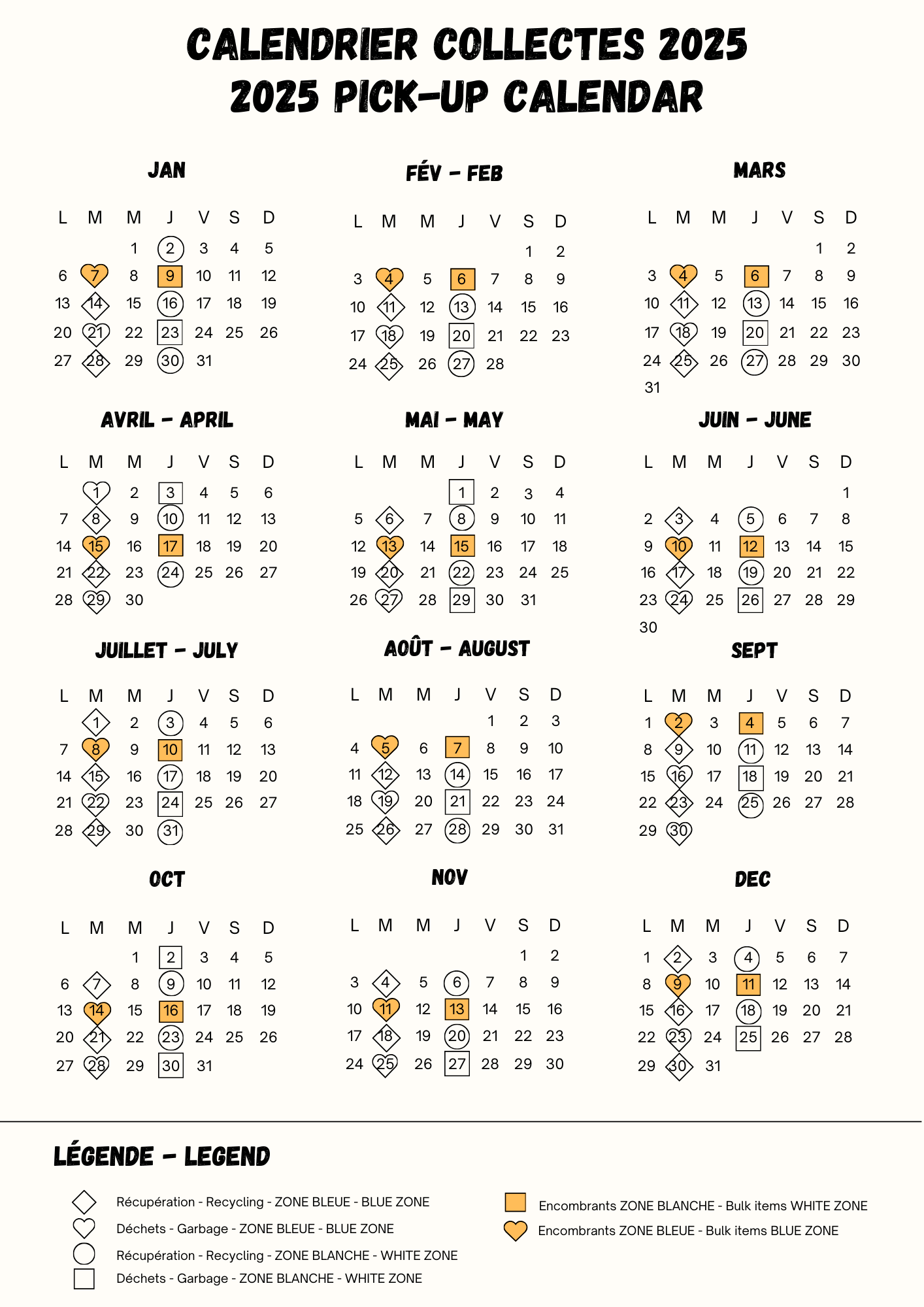 Une fois par mois, il y a un ramassage des Gros Encombrants. Un déchet encombrant désigne une matière résiduelle pouvant être définie comme un déchet ou une matière réutilisable ayant une contrainte additionnelle de gestion de par sa grande dimension et/ou son poids considérable. Sont considérés comme des résidus encombrants les meubles et articles ménagers tels que cuisinières, laveuses, sécheuses, divans, tapis, matelas, réservoirs à huile vides, chauffe-eau, etc., de même que les branches ficelées et mises en ballot de 1 mètre de longueur maximale, tel que prévu à la réglementation municipale en vigueur. Ne sont pas inclus les réfrigérateurs et congélateurs car ils contiennent des halocarbures et sont acheminés à l’Écocentre municipal par les citoyens eux-mêmes.
