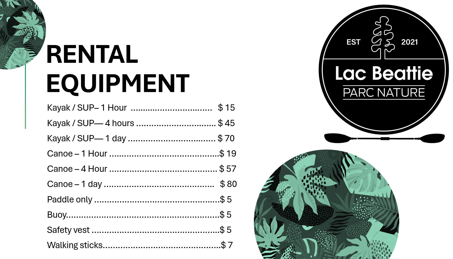 - Non-motorized boats only - no boat launches. You must walk approximately 200 meters to reach the water's edge. A dock is available for easy launching. Small electric motors are permitted. Canoes, kayaks, and stand-up paddleboards (SUPs) are available for rental at the following rates: