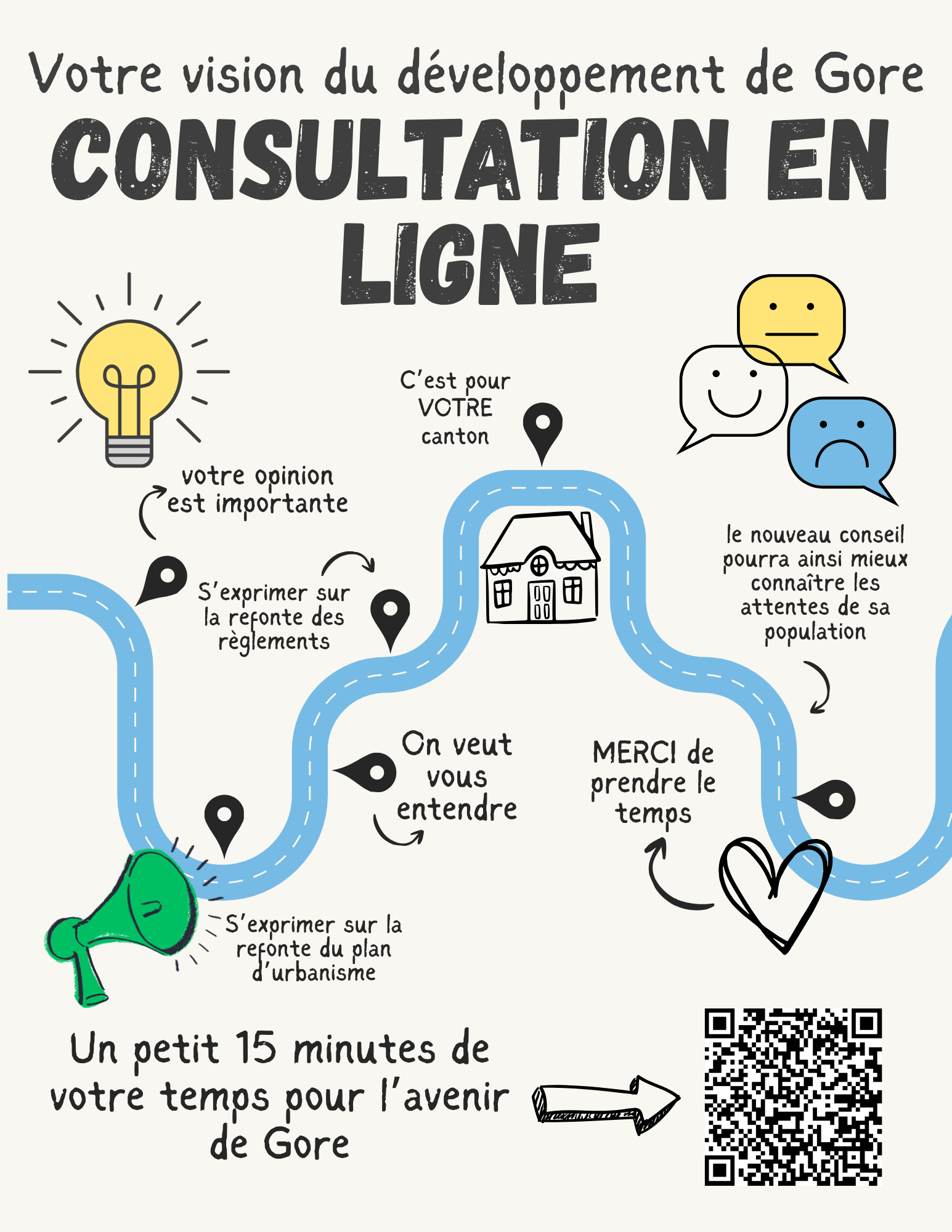 En 2025, le Canton de Gore a débuté sa démarche de révision du plan d'urbanisme. Il s’agit d’une révision complète du plan et des règlements d’urbanisme afin de les rendre cohérents avec les enjeux actuels tels que l’accès aux logements, les changements climatiques et la protection du territoire naturel. Nous vous invitons à répondre à ce court questionnaire qui ne vous prendra que 10 à 15 minutes à remplir!