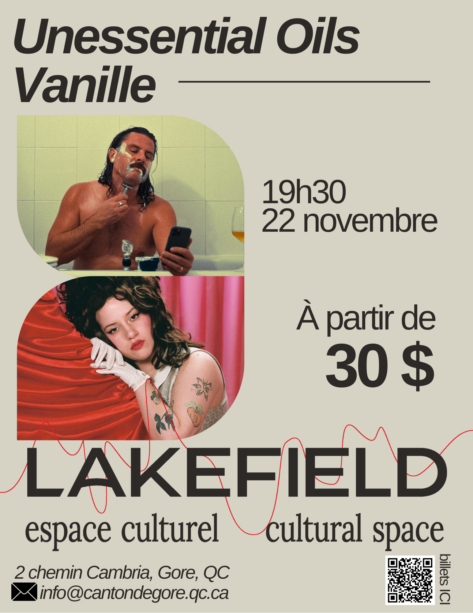 Place à la musique : canton de gore présente Unessential Oils et Vanille - 22 novembre 2025 - Espace Culturel Lakefield, Gore, QC - Lepointdevente.com
