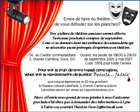 Pour réserver : ccharette@cantondegore.qc.ca ou (450) 562-2025 p. 3530
